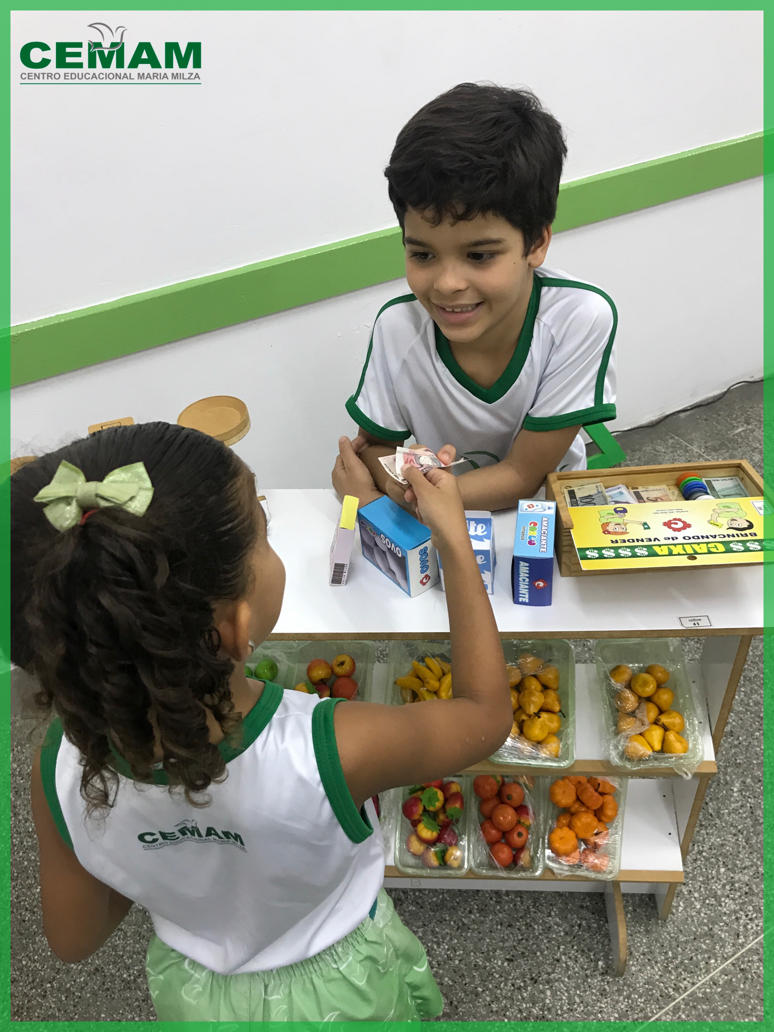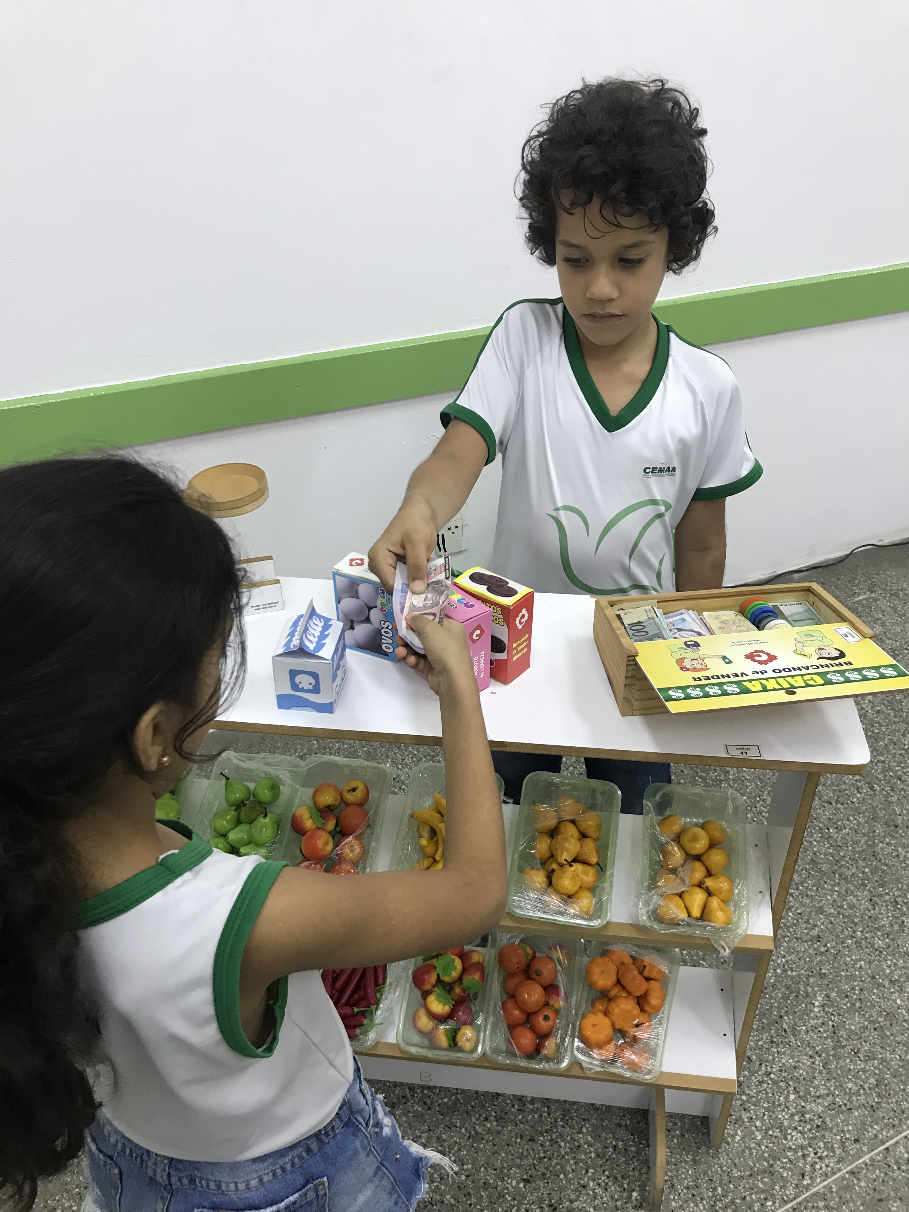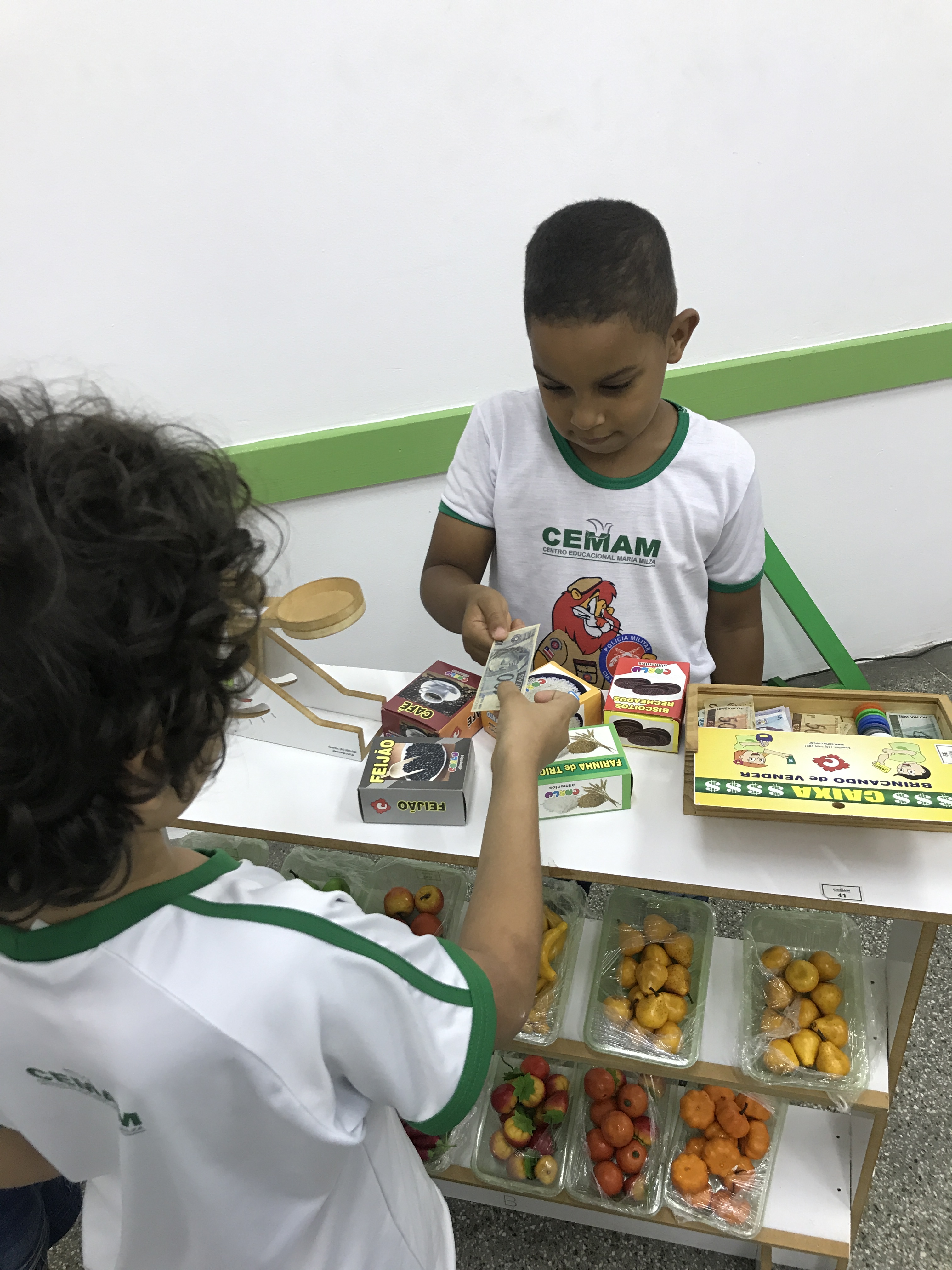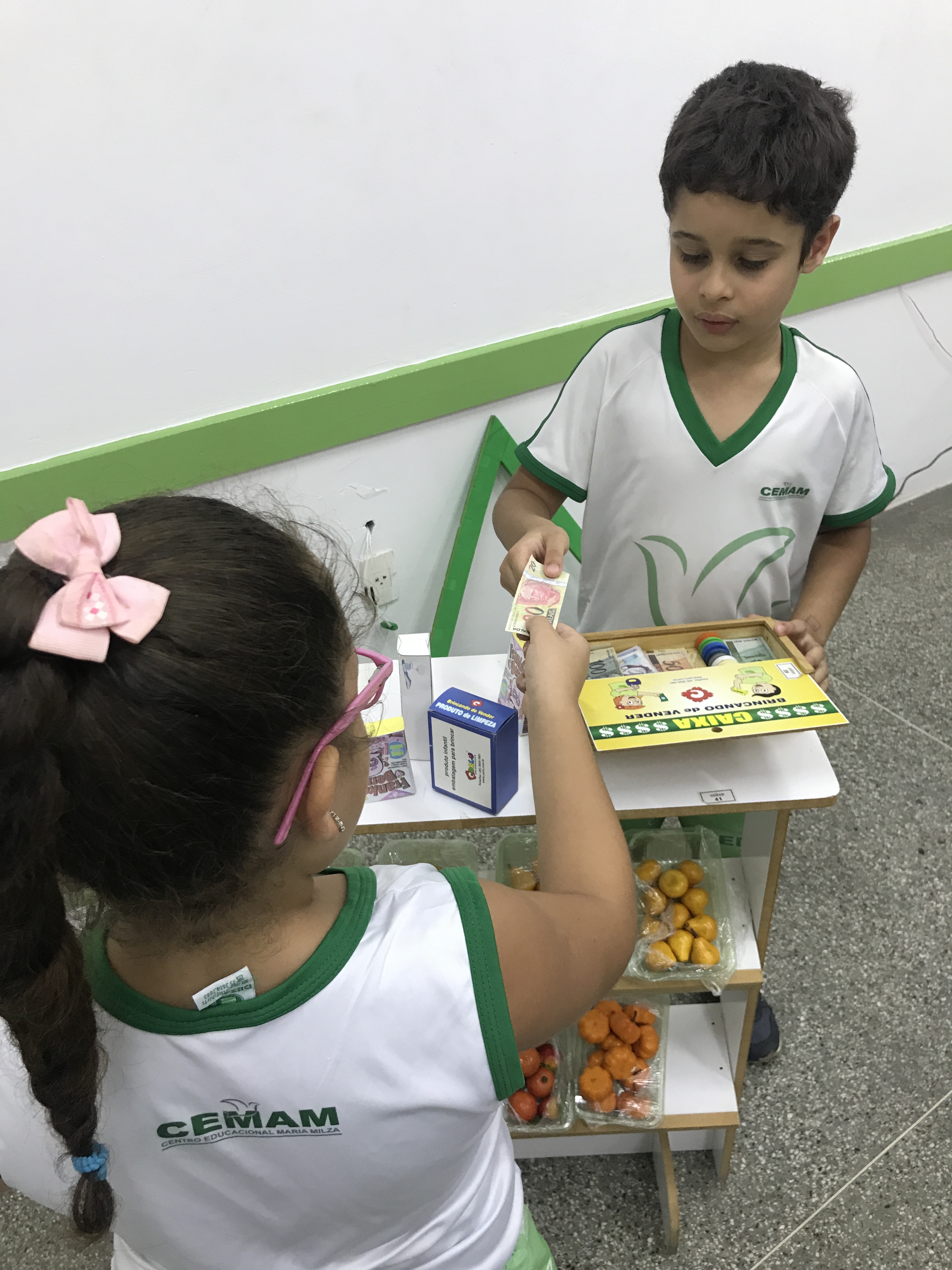 Os estudantes do 1° ano participaram de uma animada aula com a prática de comprar e vender. Conheceram o sistema monetário brasileiro e aprenderam a utilizá-lo comprando, pagando e conferindo o troco.