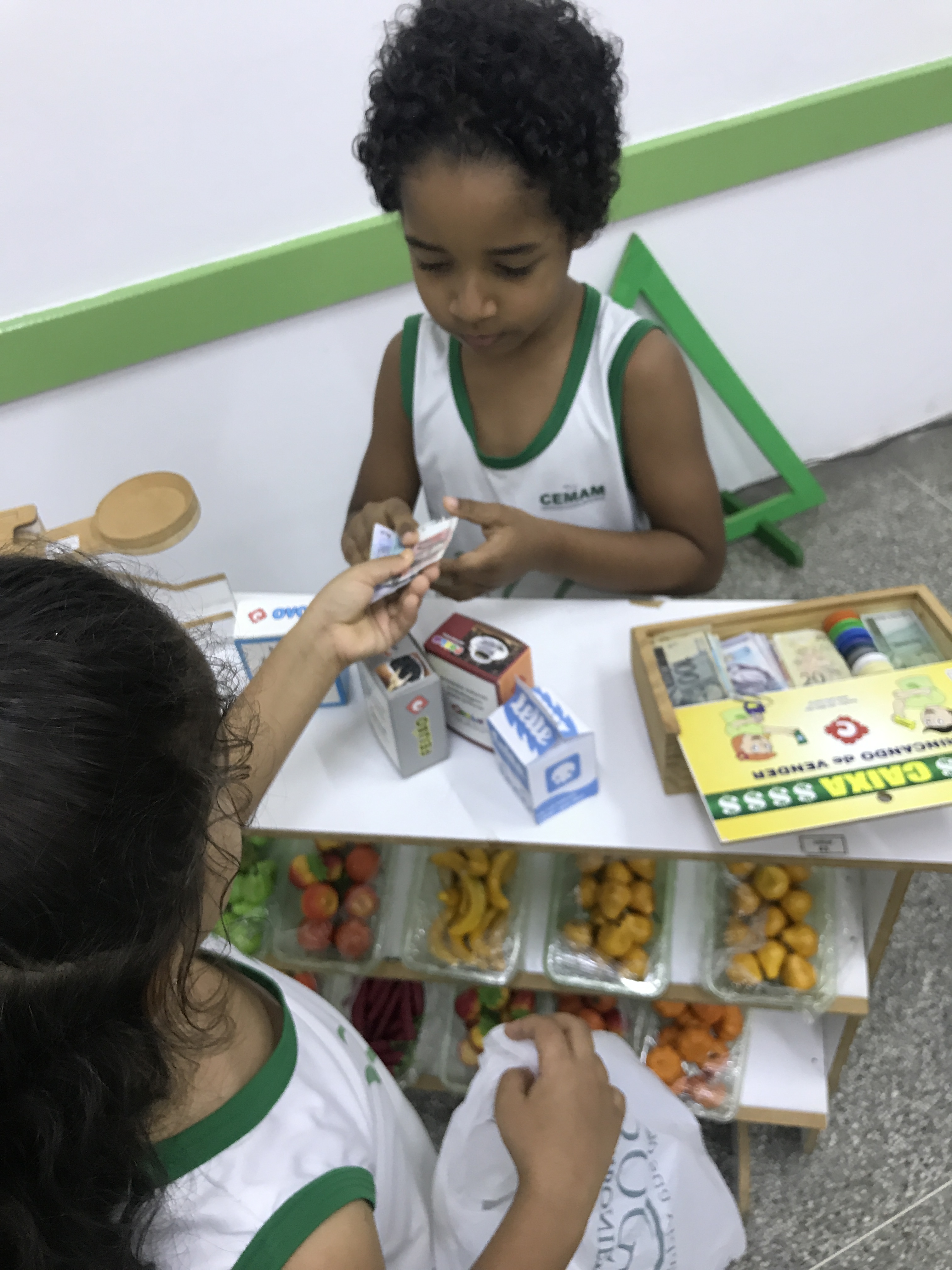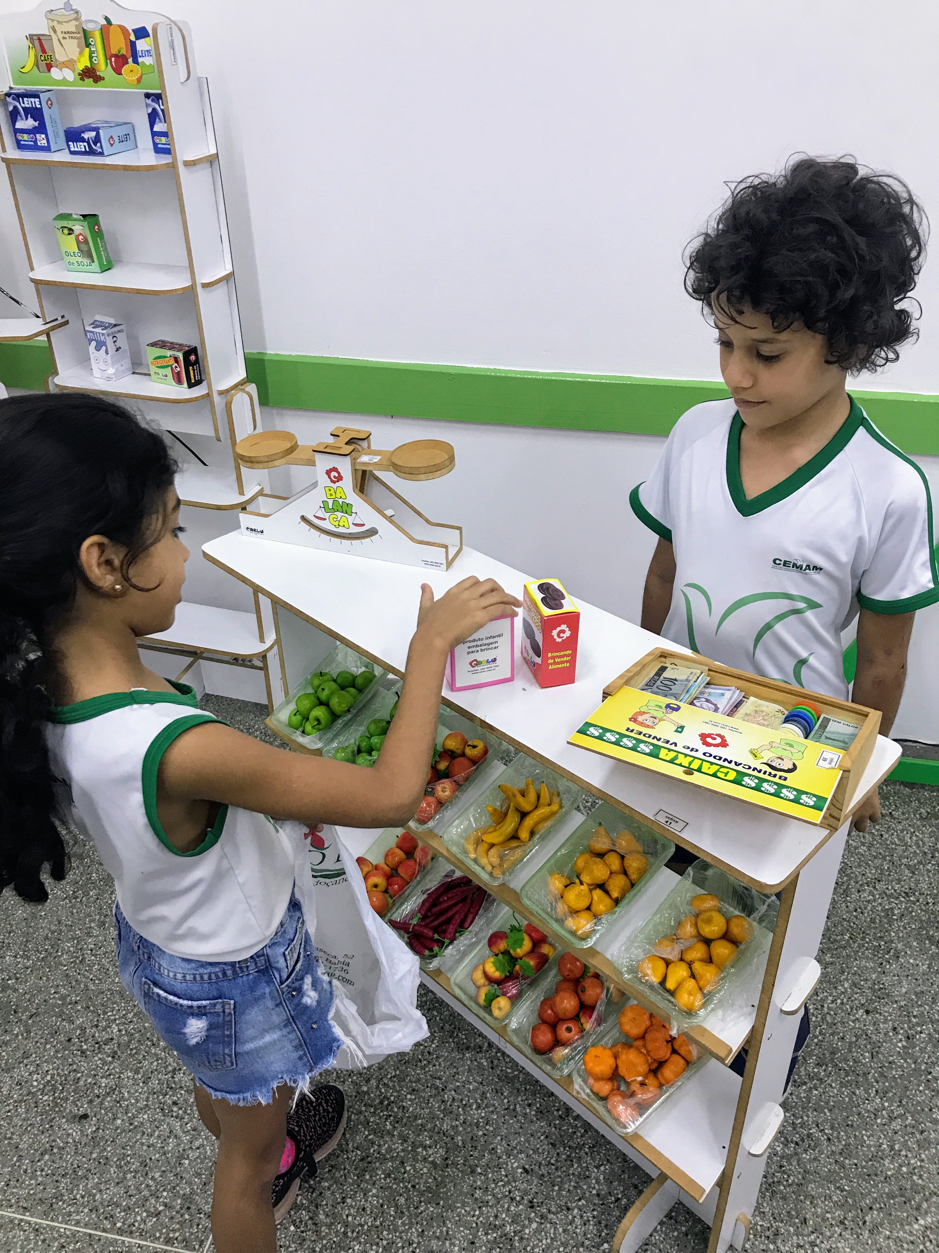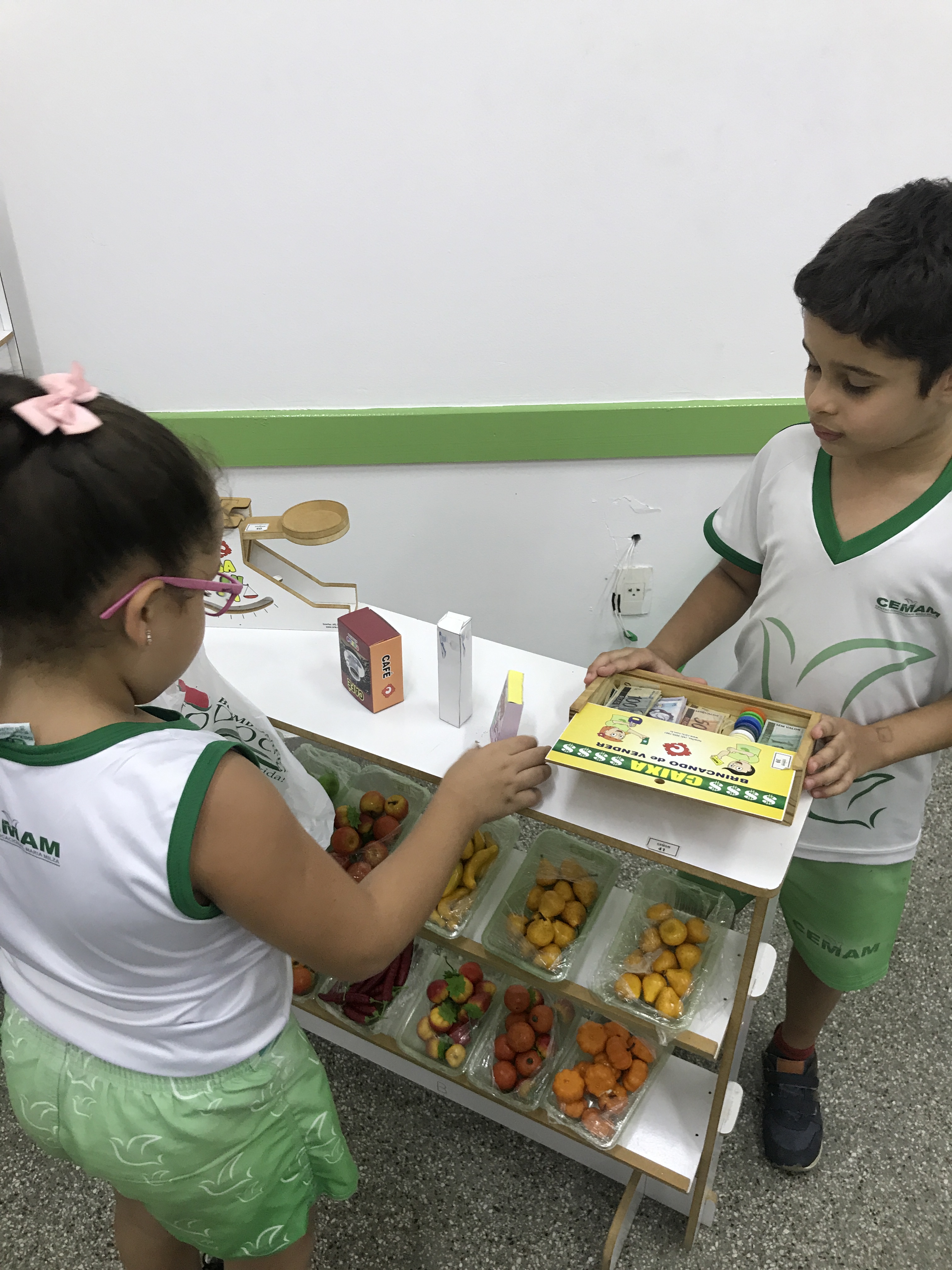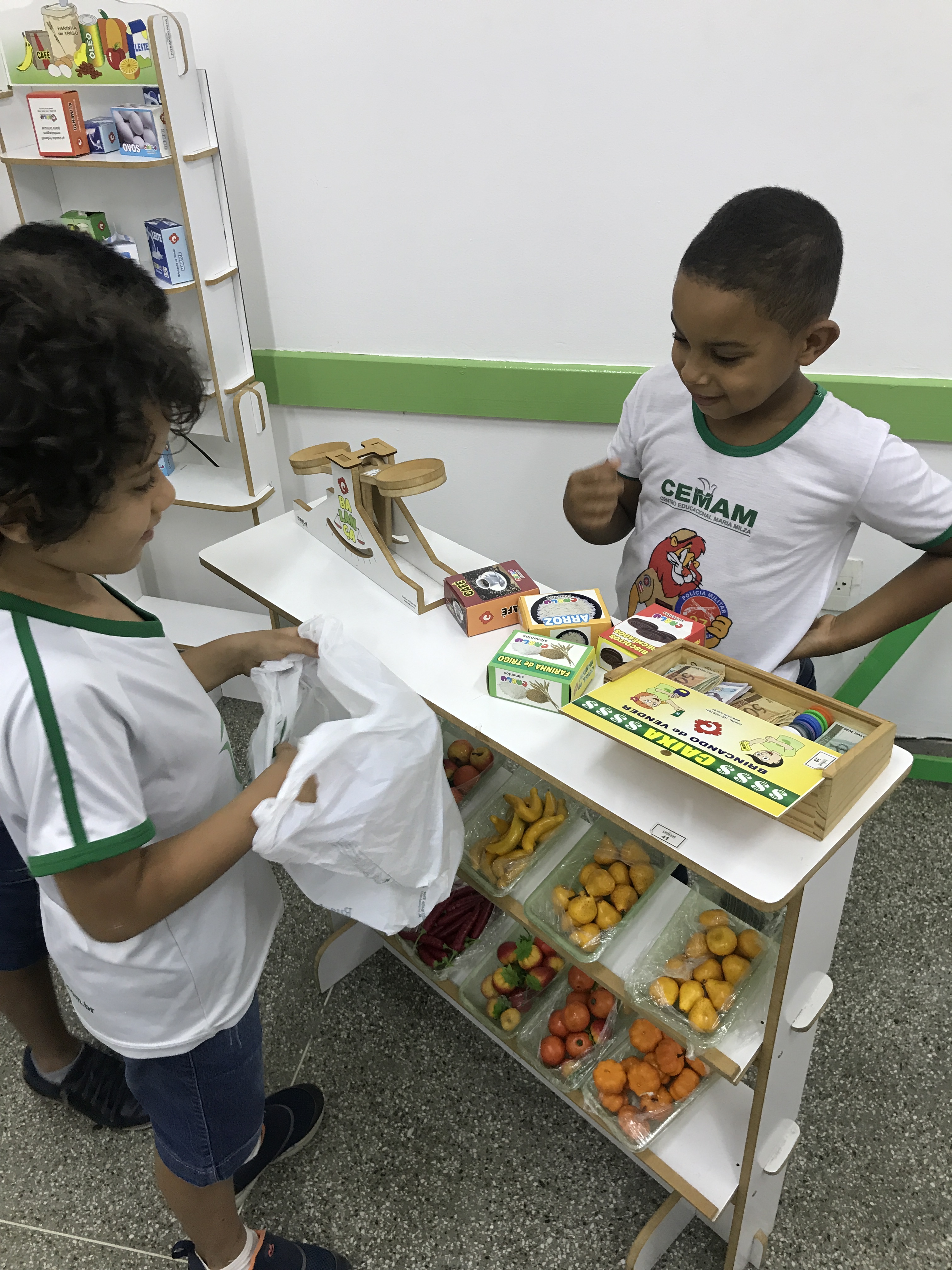 Os estudantes do 1° ano participaram de uma animada aula com a prática de comprar e vender. Conheceram o sistema monetário brasileiro e aprenderam a utilizá-lo comprando, pagando e conferindo o troco.