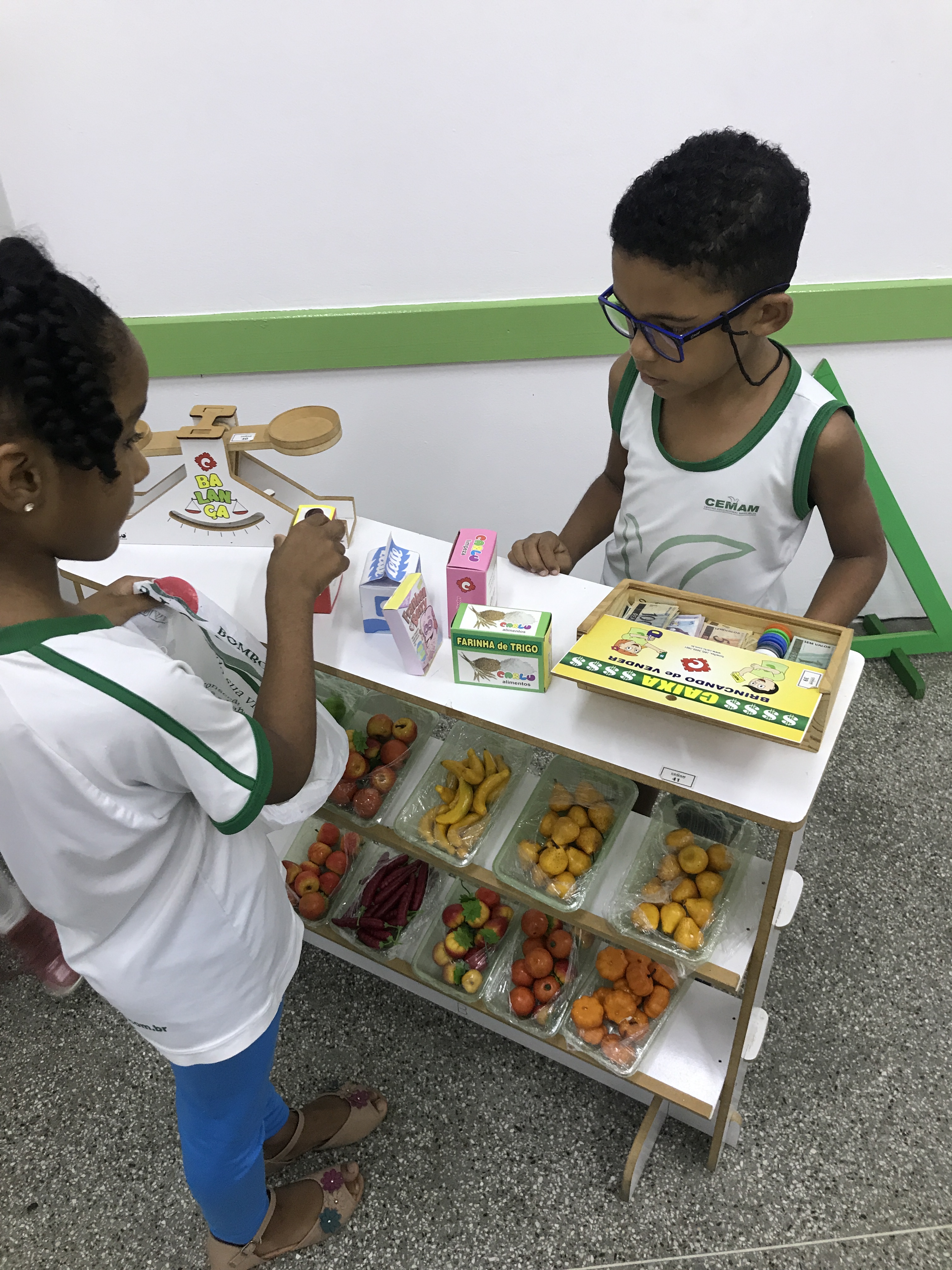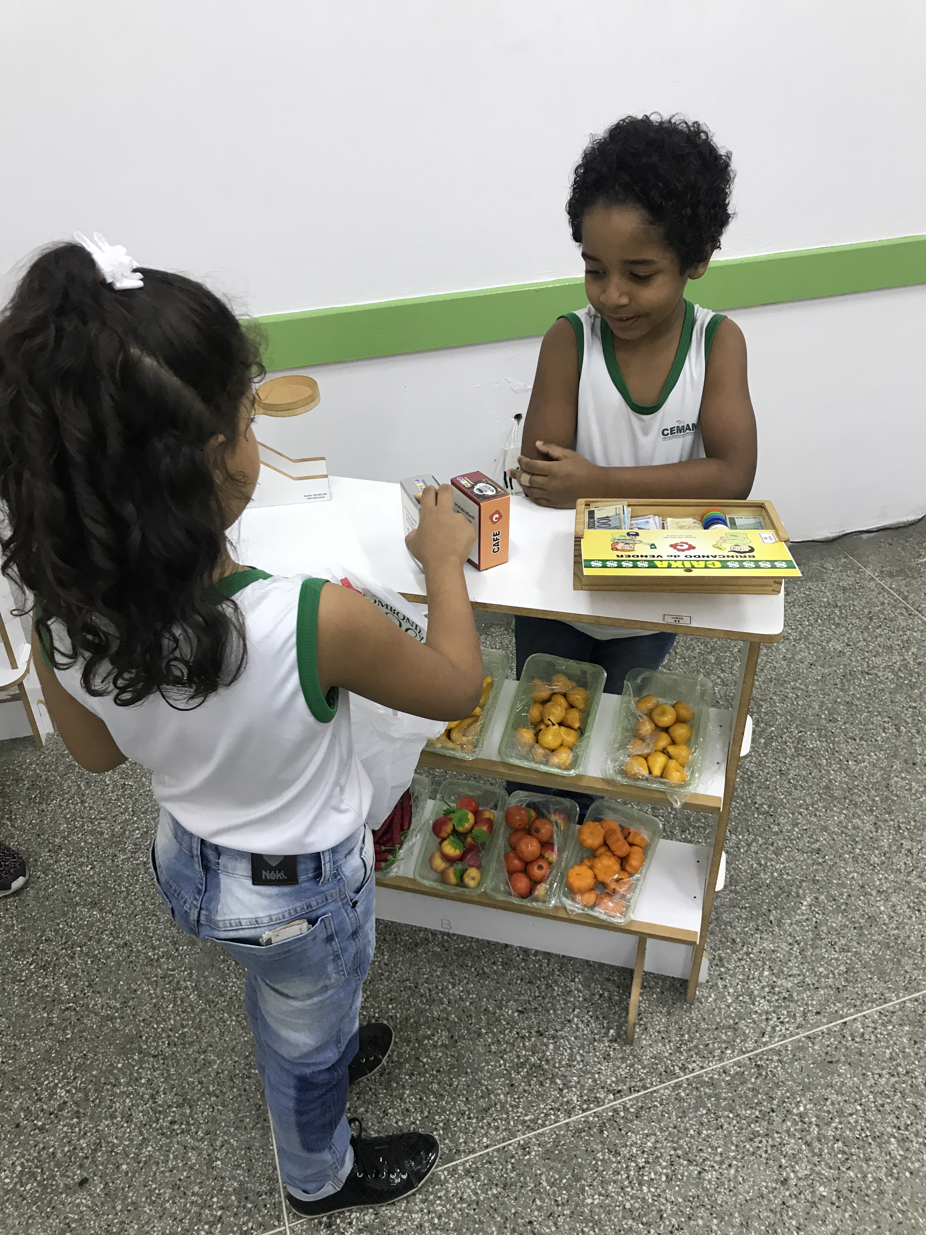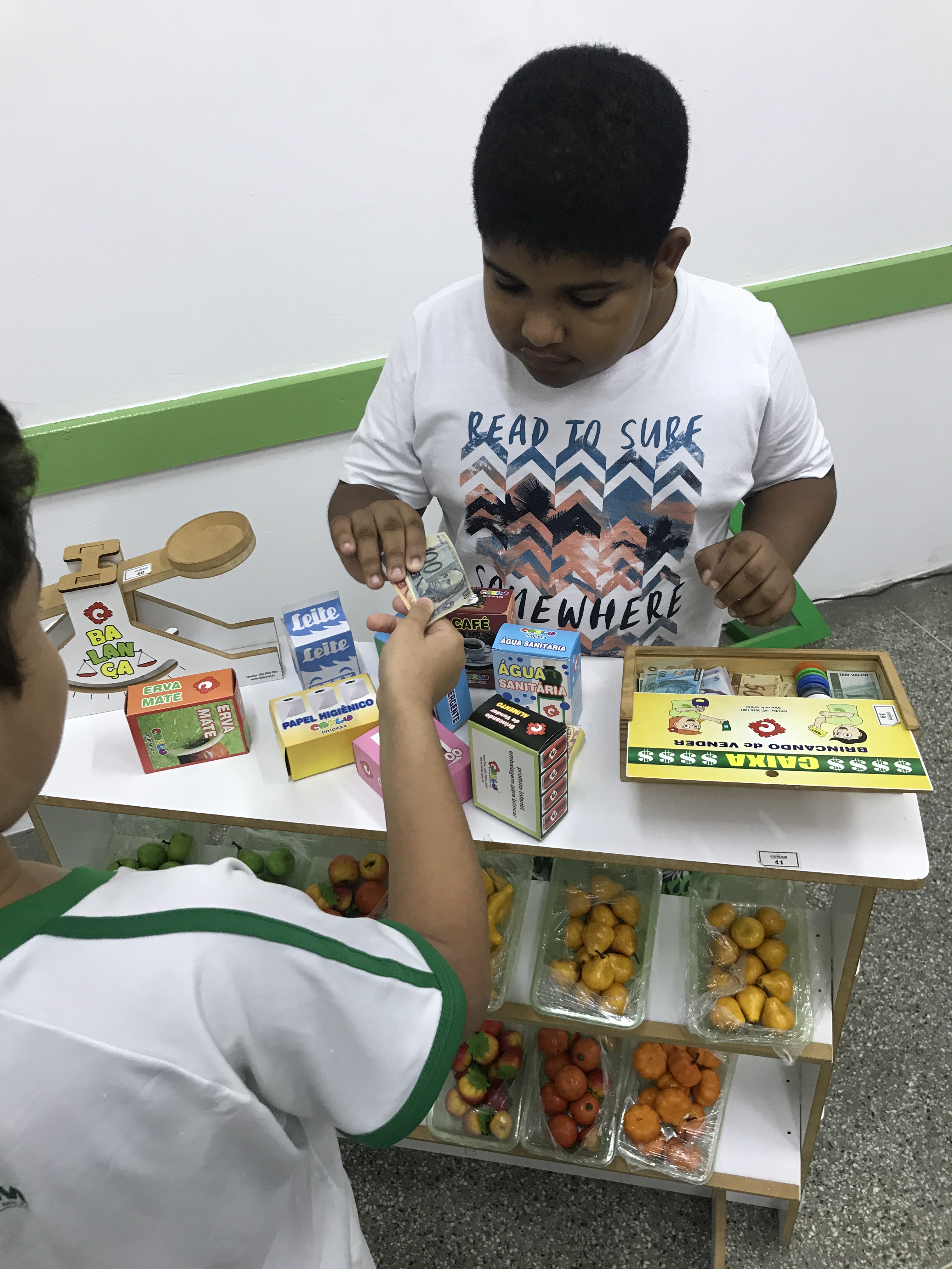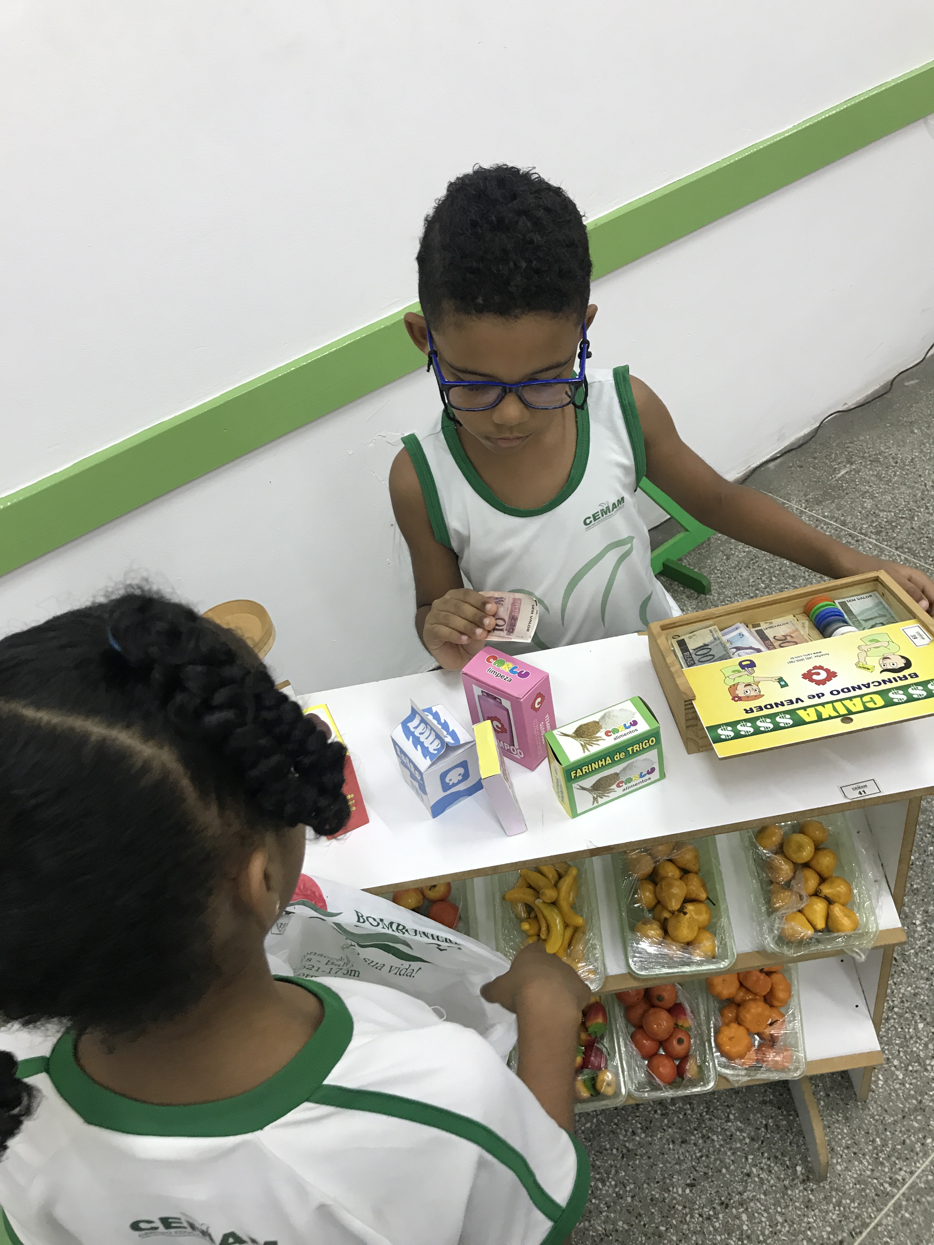 Os estudantes do 1° ano participaram de uma animada aula com a prática de comprar e vender. Conheceram o sistema monetário brasileiro e aprenderam a utilizá-lo comprando, pagando e conferindo o troco.